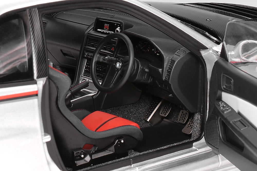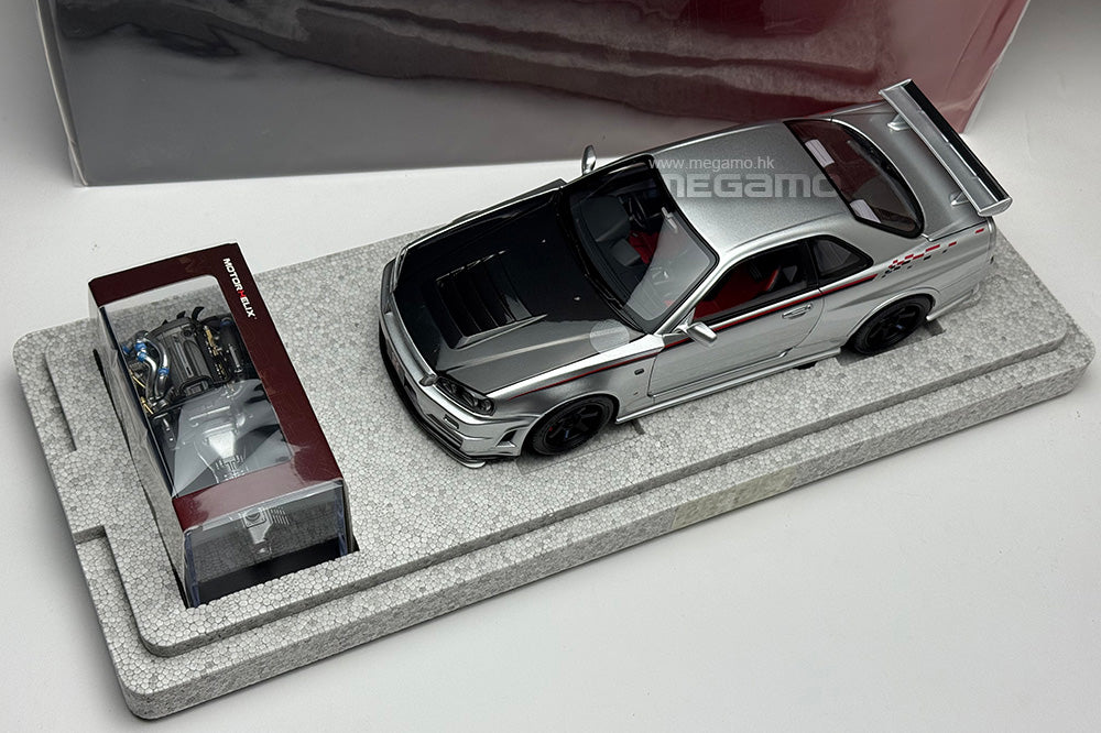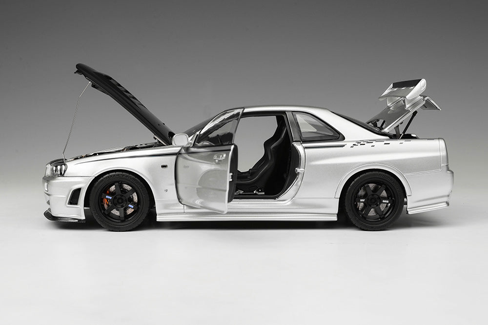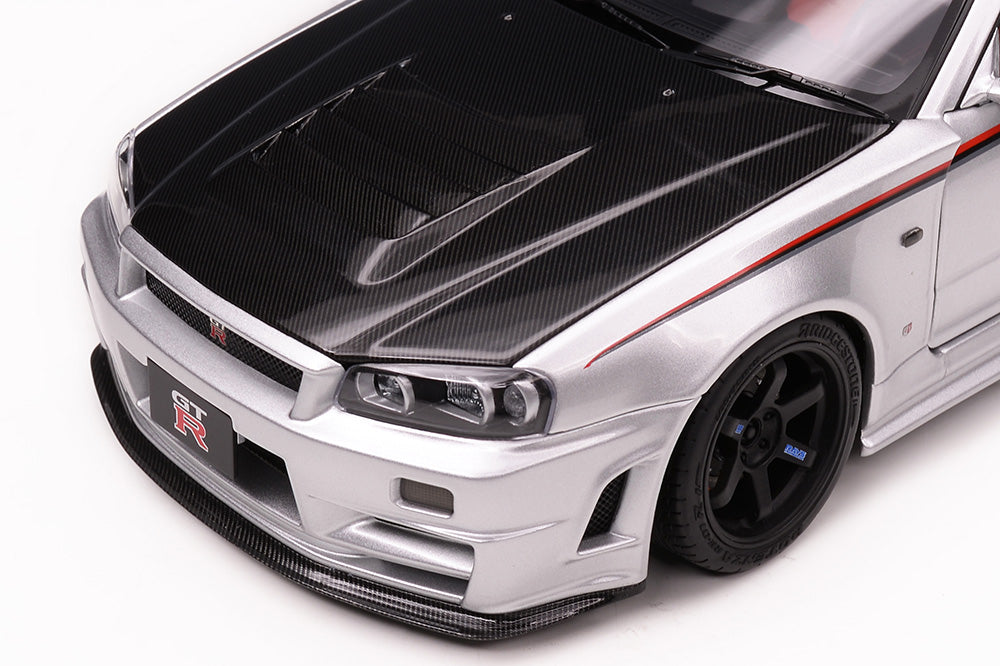 1/18 Motorhelix Nissan Skyline GT-R R34 Nismo CRS Livery Silver Carbon Fiber Hood Ltd 199 JDM Full Open Diecast with Engine Model